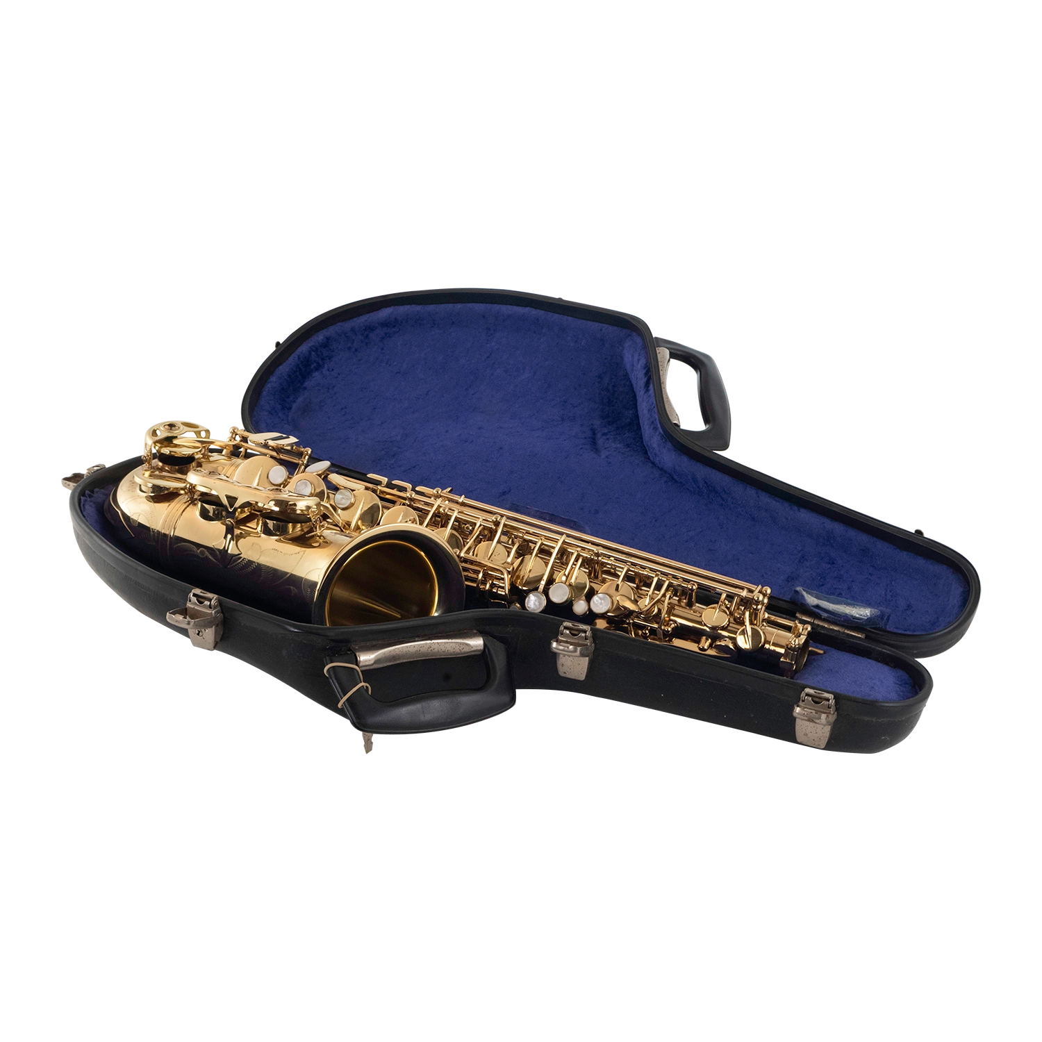 This Selmer series II comes in a hard shaped case with shoulder strap. One of the clasps is broken but the rest work and the case is still functional. There is also an metal Lawton 7 mouthpiece included with the sax but no neck sling or cleaners.