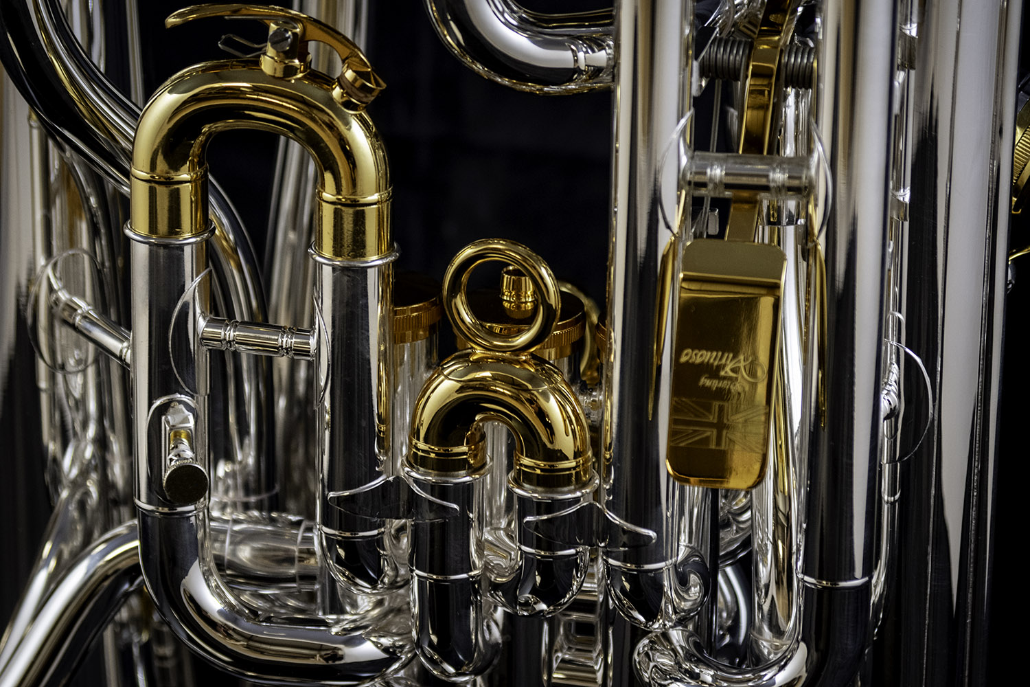 The standard model features a silver-plated finish with gold accents, a 12" yellow brass bell, and a large 15–17 mm bore complemented by a compensating 4th valve system. The Virtuoso also feature a main tuning slide trigger, for more accurate and responsive tuning, and a heavy bottom cap on the 4th valve, to offer more stability and richness to the tone.
