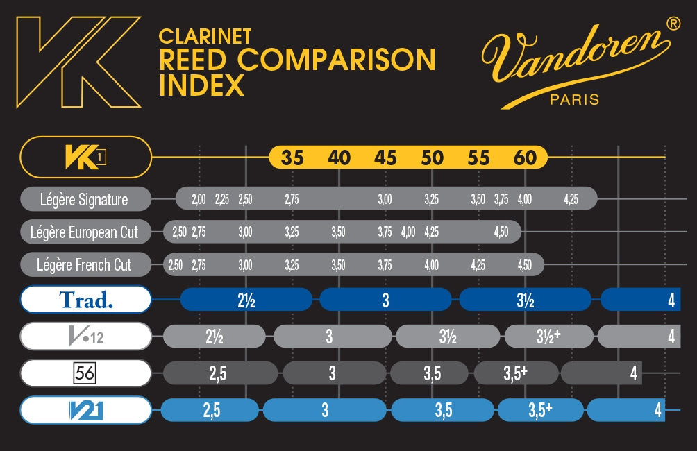 There are six Vandoren VK strengths available. All strengths fall between 2.5-3.5 traditional reed strength. The VK strengths correspond to subdivisions by thirds of the usual half strengths